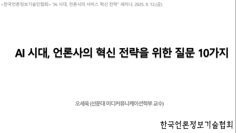 오세욱 선문대 미디어커뮤니케이션학부 교수는 'AI 시대, 언론사의 서비스 혁신 전략' 세미나 발제문을 통해 언론사가 당면한 10가지 핵심 과제를 제시하며 이같이 밝혔다. 오 교수는 AI 기술이 가져올 구조적 변화에 대응하기 위해 언론 산업과 저널리즘 두 가지 측면에서 근본적인 성찰이 필요하다고 강조했다.